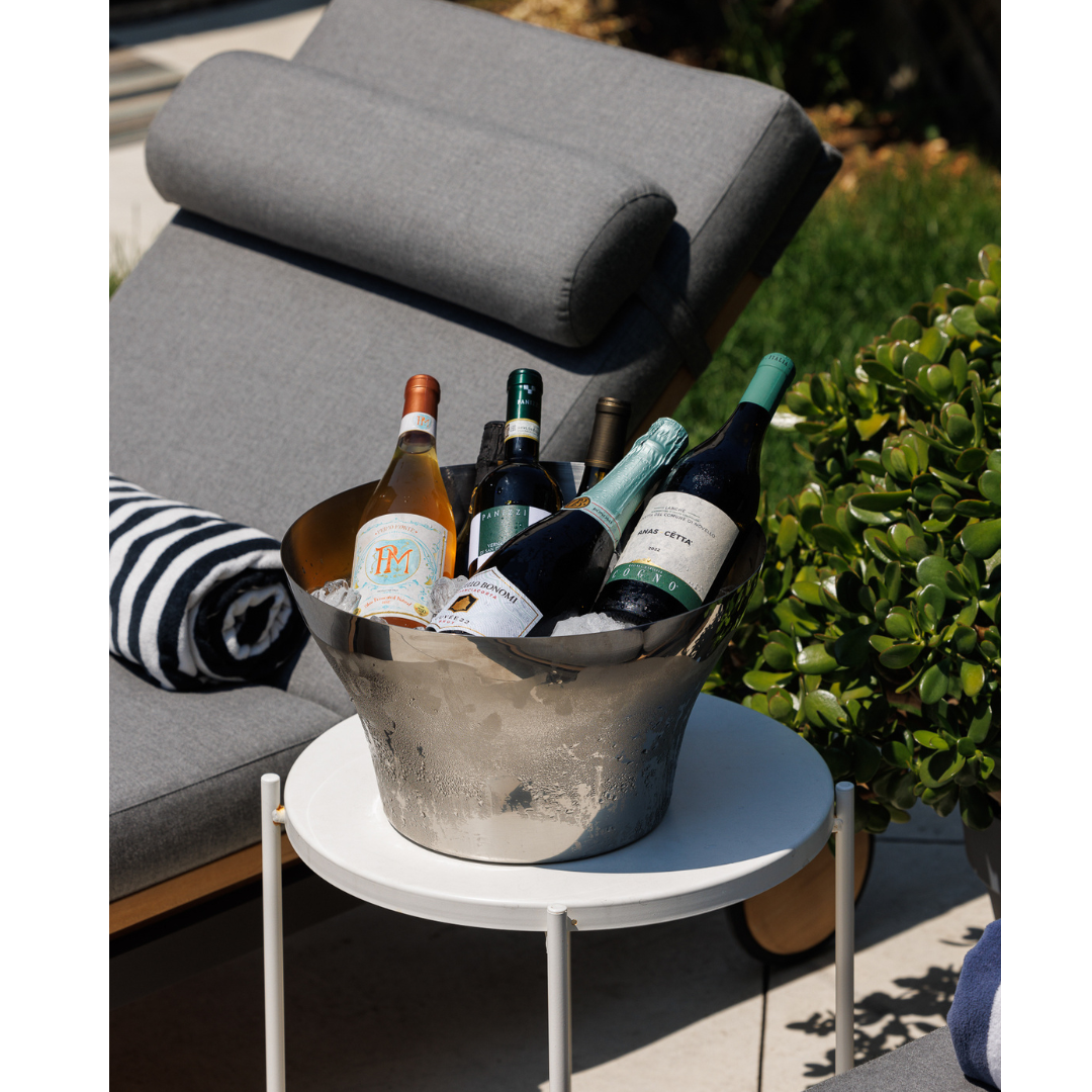Elevate your next event with the Nevada Bowl Champagne bowl. Made of durable stainless steel, it keeps your beverages chilled for longer. With its elegant shape, this stackable bowl is perfect for showcasing and presenting up to 5 bottles. Personalize it with your logo for a professional touch!